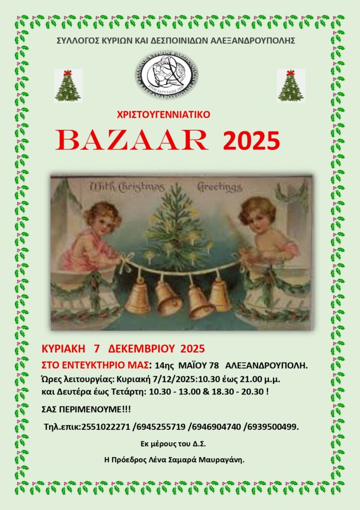 Ο Σύλλογος Κυριών και Δεσποινίδων Αλεξανδρούπολης διοργανώνει και φέτος το καθιερωμένο ετήσιο Bazaar του, ανοίγοντας τις πόρτες του στο εντευκτήριο του Συλλόγου, επί της οδού 14ης Μαΐου 78.