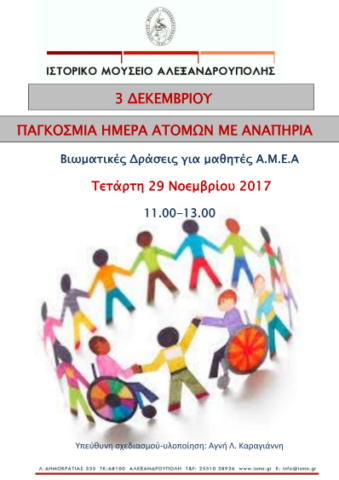 Το Ιστορικό Μουσείο Αλεξανδρούπολης με σεβασμό στον άνθρωπο και στον συνάνθρωπο διοργανώνει δράσεις για μαθητές Α.Μ.Ε.Α την Τετάρτη 29 Νοεμβρίου 2017 από τις 11:00 – 13:00, με αφορμή την παγκόσμια ημέρα ατόμων με αναπηρία. Το πρόγραμμα των δράσεων σχεδιάστηκε και θα υλοποιηθεί από την επιστημονική συνεργάτιδα του Ιστορικού Μουσείου Αγνή Λ. Καραγιάννη με ένα βιωματικό εργαστήριο σχετικά με την πόλη της Αλεξανδρούπολης μέσα από εικόνες από το παρελθόν, με αναγωγές στο παρόν.