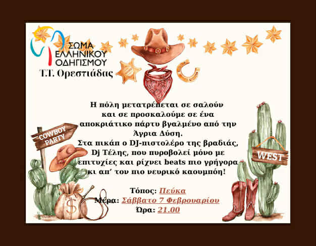 Το Σώμα Ελληνικού Οδηγισμού Τ.Τ. Ορεστιάδας μας προσκαλεί σε ένα ξεχωριστό αποκριάτικο πάρτι με άρωμα… Άγριας Δύσης!