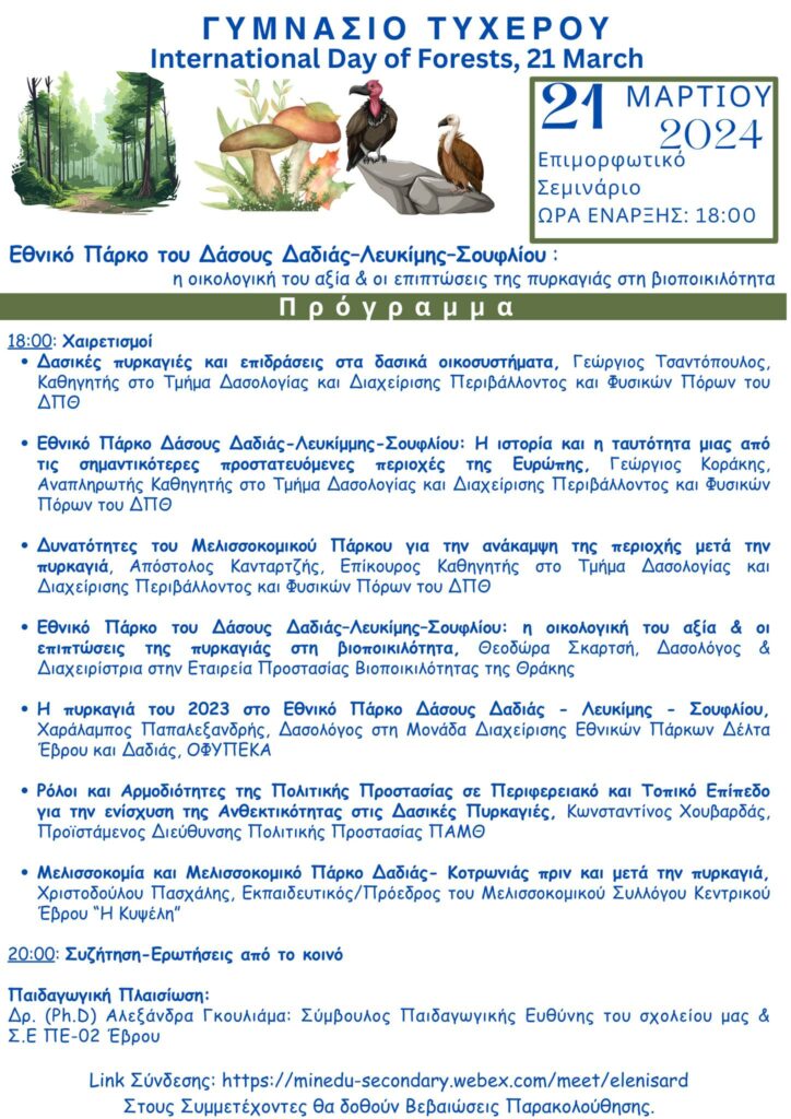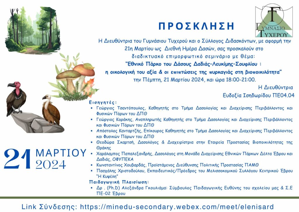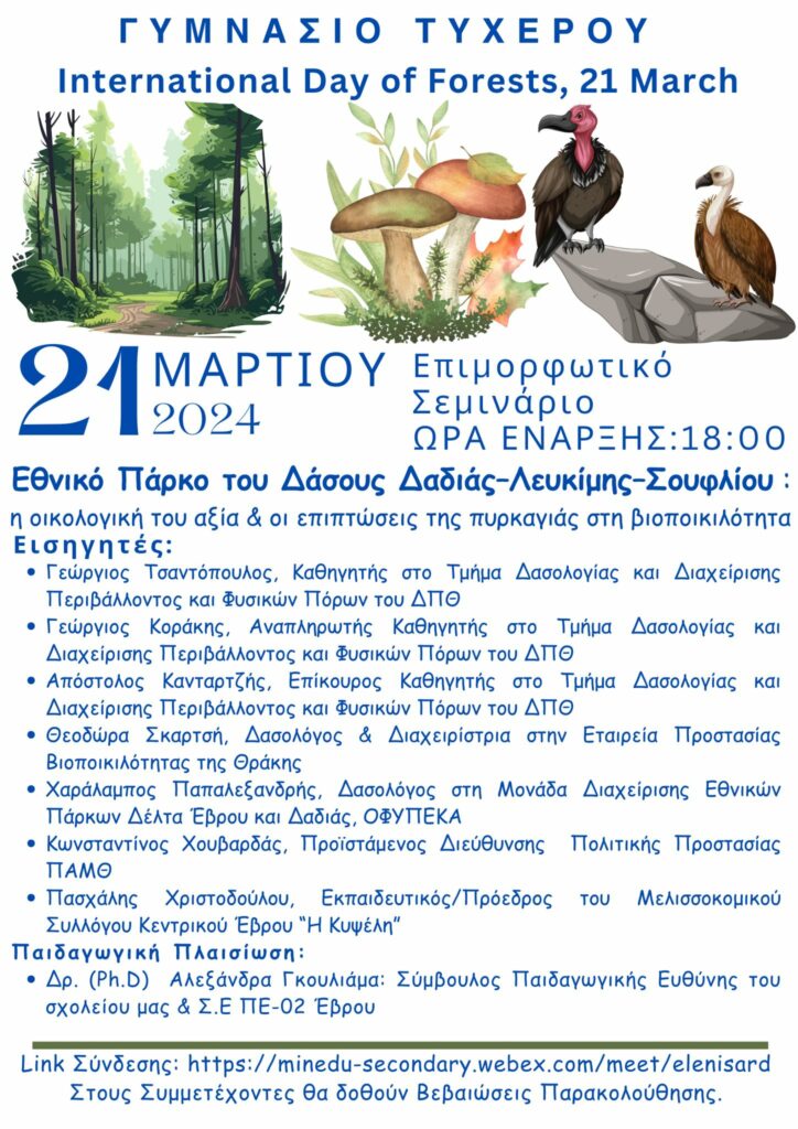 Με αφορμή την 21 Μαρτίου ως Διεθνή Ημέρα Δασών, το Γυμνάσιο Τυχερού καλεί τους εκπαιδευτικούς ΠΕ & ΔΕ και όλους τους ενδιαφερόμενους γονείς, επαγγελματίες, φοιτητές, μαθητές σε ανοικτό Διαδικτυακό Επιμορφωτικό Σεμινάριο με θέμα: