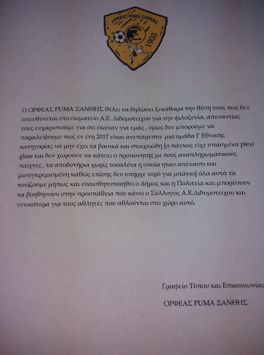 Αργότερα μέσα στην μέρα και ειδικότερα στις 17:30 με νέα του ανακοίνωση ο Ορφέας Ξάνθης επανατοποθετήθηκε για το θέμα ξεκαθαρίζοντας πως η μομφή ήταν προς τον Δήμο και την Πολιτεία και όχι προς την ομάδα της Α.Ε.Διδυμοτείχου! Σημαντικό ρόλο στην αγανάκτηση της ομάδας έπαιξε αναμφισβήτητα το πρόβλημα ύδρευσης που αντιμετωπίζει όλη η πόλη για περισσότερες από 28 ώρες το οποίο μεταξύ άλλων είχε αποτέλεσμα οι παίκτες της φιλοξενούμενης ομαδας όπως και της γηπεδούχου να μην μπορούν να κάνουν μπάνιο μετά τον αγώνα!