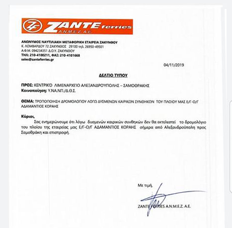 Την αδυναμία εκτέλεσης του Δρομολογίου Αλεξανδρούπολη-Σαμοθράκη και αντίστροφα λόγω των καιρικών συνθηκών γνωστοποίησε σήμερα η ZANTE Ferries πλοιοκτήτρια εταιρία του “Αδαμάντιος Κοραής”.