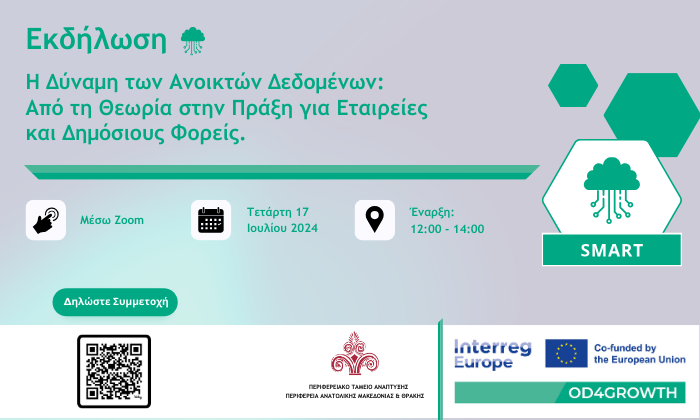 Η εκδήλωση πραγματοποιείται στο πλαίσιο του έργου OD4GROWTH – «Ενίσχυση της διαθεσιμότητας και επεξεργασίας των Ανοιχτών Δεδομένων για την υποστήριξη της τοπικής ανάπτυξης και του αστικού μετασχηματισμού», το οποίο εντάσσεται στο πρόγραμμα INTERREG Europe.