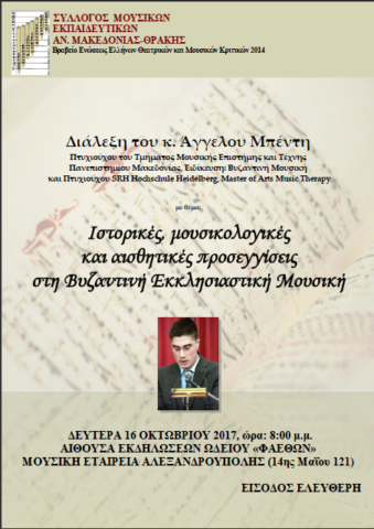 Ο Σύλλογος Μουσικών Εκπαιδευτικών Αν. Μακεδονίας – Θράκης διοργανώνει διάλεξη του Αλεξανδρουπολίτη μουσικολόγου Άγγελου Μπέντη με τίτλο «Ιστορικές, μουσικολογικές και αισθητικές προσεγγίσεις στη Βυζαντινή Εκκλησιαστική Μουσική». Η διάλεξη θα πραγματοποιηθεί στην αίθουσα του Ωδείου Φαέθων (Μουσική Εταιρεία Αλεξανδρούπολης, 14ης Μαΐου 121) τη Δευτέρα 16 Οκτωβρίου, στις 8.00 μ.μ.