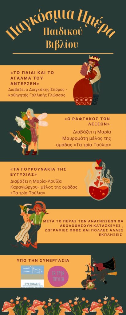 Μετά το πέρας των αναγνώσεων θα ακολουθήσουν διάφορες κατασκευές και ζωγραφιές για όλα τα παιδιά καθώς επίσης και πολλές εκπλήξεις . Την εκδήλωση θα πλαισιώσουν τα μέλη της εθελοντικής ομάδας ανάγνωσης ‘’Τα τρία Τούλια’’.