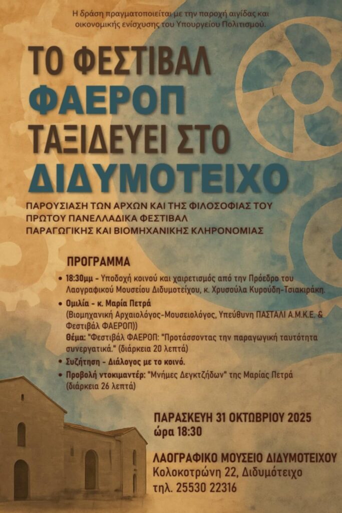 Η ΠΑΣΤΑΛΙ ΑΜΚΕ, με την υποστήριξη του Λαογραφικού Μουσείου Διδυμοτείχου, προσκαλεί το κοινό την Παρασκευή 31 Οκτωβρίου 2025, στις 18:30, στο χώρο του Λαογραφικού Μουσείου Διδυμοτείχου, στην εκδήλωση με τίτλο: «Το φεστιβάλ ΦΑΕΡΟΠ ταξιδεύει στο Διδυμότειχο: Παρουσίαση των αρχών και της φιλοσοφίας του πρώτου πανελλαδικά φεστιβάλ παραγωγικής και βιομηχανικής κληρονομιάς».