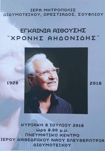 Σύμφωνα με ανακοίνωση της Ιεράς Μητροπόλεως Διδυμοτείχου, Ορεστιάδος και Σουφλίου με ιδιαίτερη χαρά ανακοινώνεται στο φιλόμουσο κοινό, ότι ύστερα από γενναία προσφορά του μεγάλου συντοπίτη μας μουσικού Χρόνη Αηδονίδη, εγκαινιάζεται την Κυριακή 8 Ιουλίου 2018 και ώρα 8:00 μ.μ. Έκθεση προσωπικών του αντικειμένων.