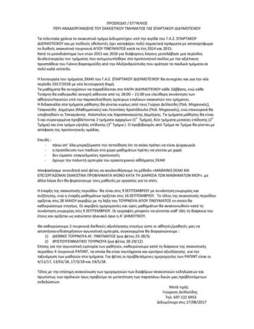Σύμφωνα με όσα αναφέρονται, η λειτουργία του τμήματος ΣΚΑΚΙ του Γ.Α.Σ. Σπάρτακος θα συνεχίσει και για την νέα περίοδο 2017-2018 με νέα λειτουργική δομή.