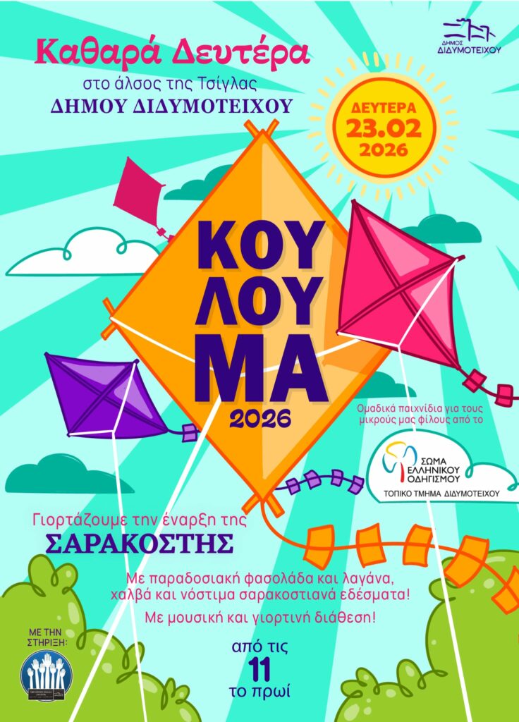 Ο Δήμος Διδυμοτείχου σας προσκαλεί να γιορτάσετε μαζί την Καθαρά Δευτέρα, τη Δευτέρα 23 Φεβρουαρίου 2026, από τις 11:00 το πρωί, στο όμορφο Δάσος της Τσίγγλας στο Διδυμότειχο