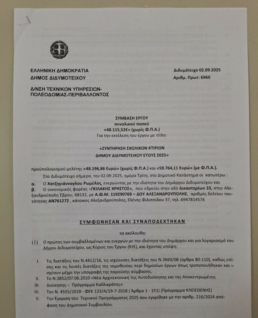 Σύμβαση έργου για τη συντήρηση σχολικών κτιρίων του Δήμου Διδυμοτείχου υπεγράφη μεταξύ Δημάρχου και αναδόχου, όπως αναφέρει στην ανακοίνωσή της η Δημοτική Αρχή: