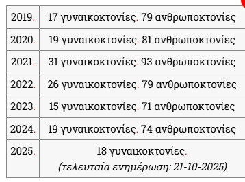 Για το 2025, που διανύουμε, ο μόνος μήνας χωρίς γυναικοκτονίες είναι ο τρέχων Νοέμβριος με δεδομένο ωστόσο ότι η καταγραφή φτάνει μέχρι τις 21/10. Με έρευνα από ΜΜΕ και φεμινιστικές οργανώσεις καταγράφονται 10 γυναικοκτονίες ωστόσο το Ελληνικό Τμήμα του Ευρωπαϊκού Παρατηρητηρίου για τη Γυναικοκτονία (femicide.gr) αναφέρει 18 γυναικοκτονίες εώς τις 21 Οκτωβρίου 2025. Σύμφωνα με την ίδια πηγή ο Μάϊος ήταν ο μήνας με τις περισσότερες γυναικοκτονίες, τέσσερις, τρεις καταγράφηκαν το Φεβρουάριο και από δύο συνεχόμενα τους μήνες Ιούλιο εώς Οκτώβριο.