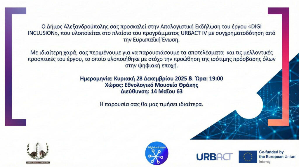Ο Δήμος Αλεξανδρούπολης σας καλεί στην απολογιστική συνάντηση του έργου Digi Inclusion του ευρωπαϊκού προγράμματος URBACT IV, που θα πραγματοποιηθεί την Κυριακή 28 Δεκεμβρίου 2025, ώρα 19.00 στον φιλόξενο χώρο του Εθνολογικού Μουσείου Θράκης.