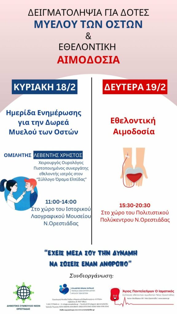Έτσι, λοιπόν, έχουμε οργανώσει μια διήμερη δράση στις 18 και 19 Φεβρουαρίου, η οποία θα έχει ως θεματικές την «ΔΕΙΓΜΑΤΟΛΗΨΙΑ ΓΙΑ ΔΟΤΕΣ ΜΥΕΛΟΥ ΤΩΝ ΟΣΤΩΝ ΚΑΙ ΤΗΝ ΕΘΕΛΟΝΤΙΚΗ ΑΙΜΟΔΟΣΙΑ». Στόχος μας, αφενός, είναι η ευαισθητοποίηση αλλά παράλληλα και η ενημέρωση των συμπολιτών μας για την έννοια τι σημαίνει να είσαι δότης μυελού των οστών, αφετέρου, δίνοντας αίμα, μπορεί να σωθεί μια ζωή!