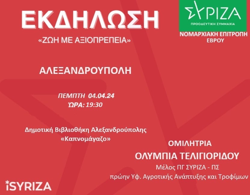 19:30- Ανοιχτή εκδήλωση-συζήτηση με μέλη και φίλους του ΣΥΡΙΖΑ ΠΣ Έβρου στη Δημοτική Βιβλιοθήκη Αλεξανδρούπολης “Καπνομάγαζο”.