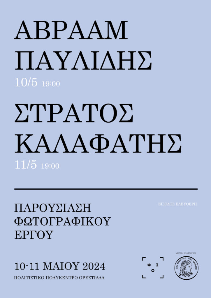Δύο σημαντικά ονόματα της Ελληνικής Φωτογραφίας παρουσιάζουν το έργο τους στην πόλη μας!!! Μετά από πρόταση των Φωτογραφικών Συναντήσεων Ορεστιάδας έχουμε τη χαρά να ανακοινώσουμε τη διοργάνωση διημερίδας με τον Αβραάμ Παυλίδη την Παρασκευή 10 Μάϊου (19:00) και τον Στράτο Καλαφάτη το Σάββατο 11 Μάϊου (19:00) στο Πολιτιστικό Πολύκεντρο Ορεστιάδας. Η παρουσία σας στις εκδηλώσεις μας θα ειναι χαρά μας και μεγάλη μας τιμή!