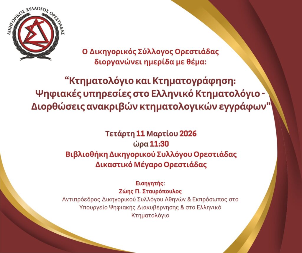 Η εκδήλωση θα πραγματοποιηθεί την Τετάρτη 11 Μαρτίου 2026 και ώρα 11:30, στη Βιβλιοθήκη του Δικηγορικού Συλλόγου Ορεστιάδας, στο Δικαστικό Μέγαρο Ορεστιάδας.