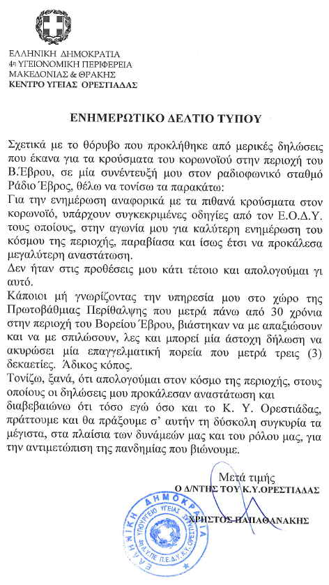 Τονίζω, ξανά, ότι απολογούμαι στον κόσμο της περιοχής, στους οποίους οι δηλώσεις μου προκάλεσαν αναστάτωση και διαβεβαιώνω ότι τόσο εγώ όσο και το κέντρο υγείας Ορεστιάδας, πράττουμε και θα πράξουμε σ’ αυτή τη δύσκολη συγκυρία τα μέγιστα, στα πλαίσια των δυνάμεων μας και του ρόλου μας, για την αντιμετώπιση της πανδημίας που βιώνουμε.