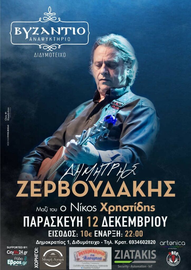 Το Διδυμότειχο ετοιμάζεται να υποδεχτεί μία από τις πιο χαρακτηριστικές και αγαπημένες φωνές της ελληνικής μουσικής σκηνής. Ο Δημήτρης Ζερβουδάκης, ένας καλλιτέχνης που εδώ και δεκαετίες αφήνει το δικό του, ανεξίτηλο αποτύπωμα στο ελληνικό τραγούδι, θα εμφανιστεί την Παρασκευή 12 Δεκεμβρίου στο «Βυζάντιο», για μια βραδιά γεμάτη συναίσθημα, ρυθμό και αληθινή μουσική.