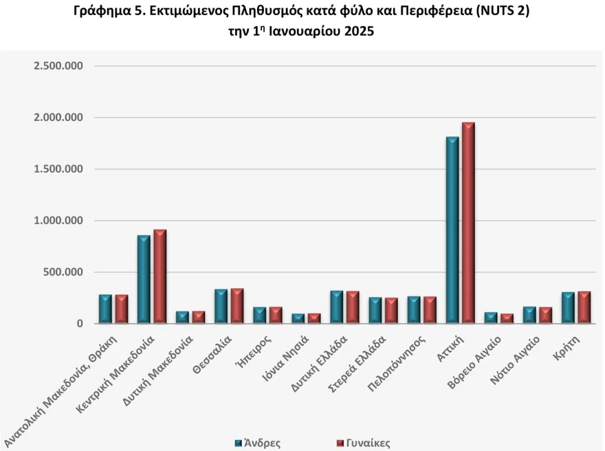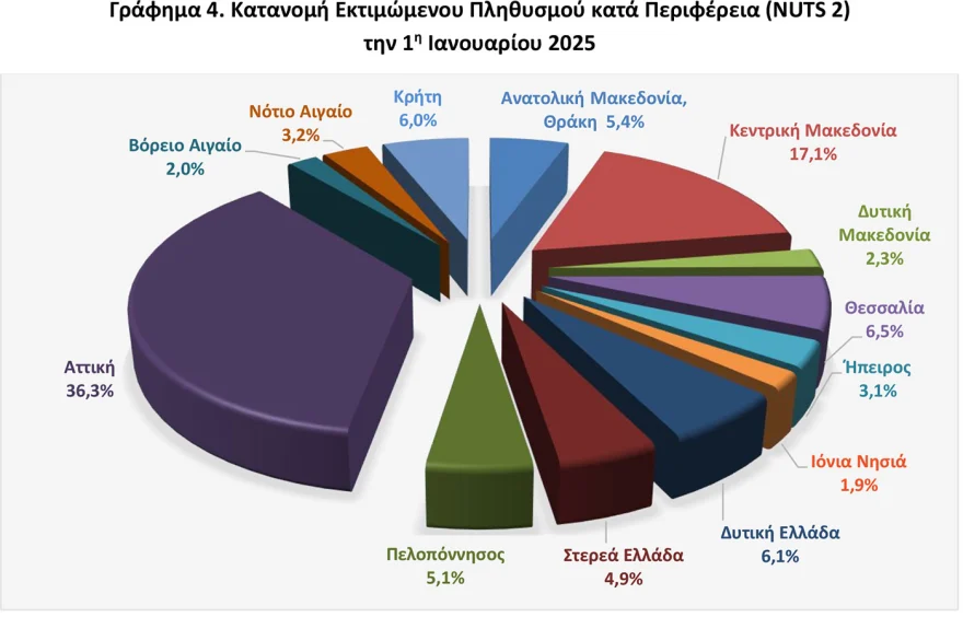 Παράλληλα, εξίσου ανησυχητικά είναι και τα δημογραφικά χαρακτηριστικά: Την 1η Ιανουαρίου του 2025 ο πληθυσμός ηλικίας 65 ετών και άνω αντιστοιχούσε στο 23,7%, ενώ τα παιδιά 0–14 ετών μόλις στο 12,8%.