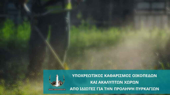 Για τον υποχρεωτικό καθαρισμό οικοπέδων και ακάλυπτων χωρών από ιδιώτες για την πρόληψη πυρκαγιών ενημερώνει ο Δήμος Αλεξανδρούπολης: