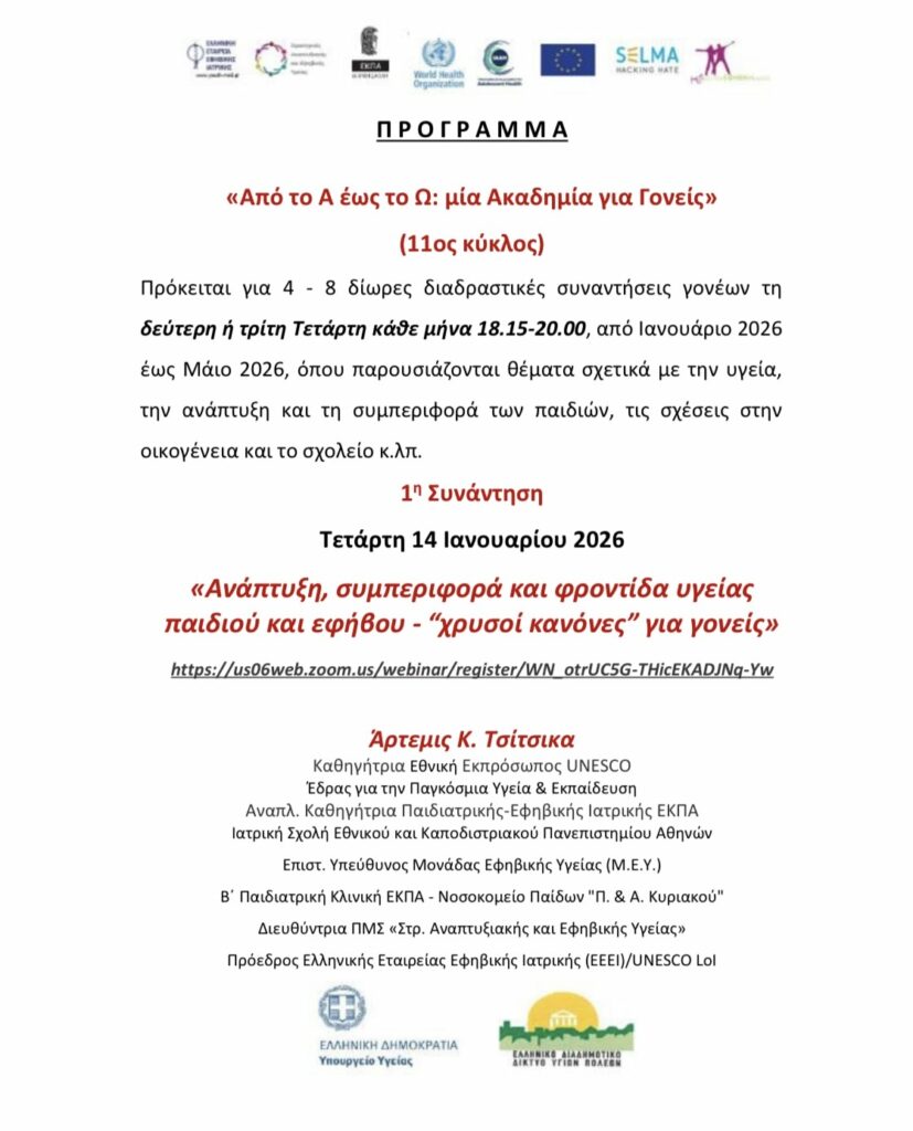 Το Ελληνικό Διαδημοτικό Δίκτυο Υγιών Πόλεων (ΕΔΔΥΠΠΥ) σε συνεργασία με τον Δήμο Σουφλίου σας προσκαλεί να παρακολουθήσετε τον 11ο κύκλο προγραμμάτων προαγωγής υγείας «Από το Α έως το Ω: μία Ακαδημία για Γονείς»