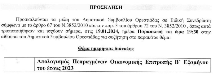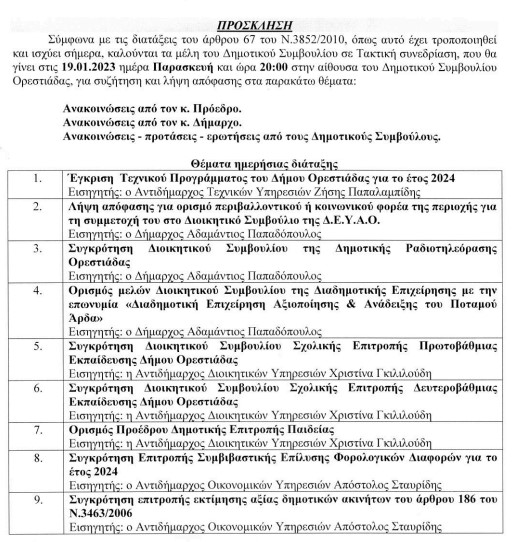 Διπλή συνεδρίαση την Παρασκευή 19 Ιανουαρίου για το Δημοτικό Συμβούλιο Ορεστιάδας με μία τακτική και μία ειδική συνεδρίαση
