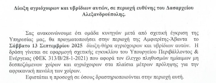Σε εφαρμογή των προβλεπόμενων μέτρων για την πρόληψη της εξάπλωσης της αφρικανικής πανώλης των χοίρων, το Δασαρχείο Αλεξανδρούπολης ανακοινώνει τη διεξαγωγή οργανωμένης δίωξης-θήρας αγριόχοιρων και υβριδίων αυτών, το Σάββατο 13 Σεπτεμβρίου 2025.