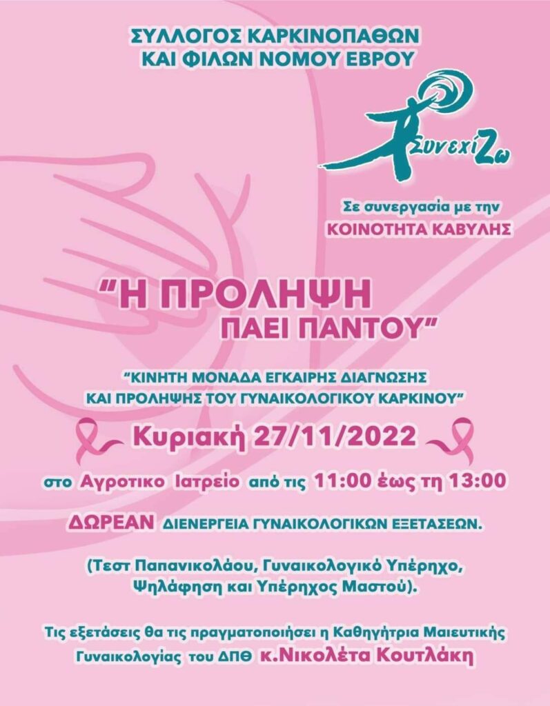 Ο Σύλλογος Καρκινοπαθών και Φίλων Νομού Έβρου ΣυνεχίΖΩ, σε συνεργασία με την Κοινότητα Καβύλης, διενεργούν ΔΩΡΕΑΝ γυναικολογικές εξετάσεις στην Καβύλη την Κυριακή 27 Νοεμβρίου.