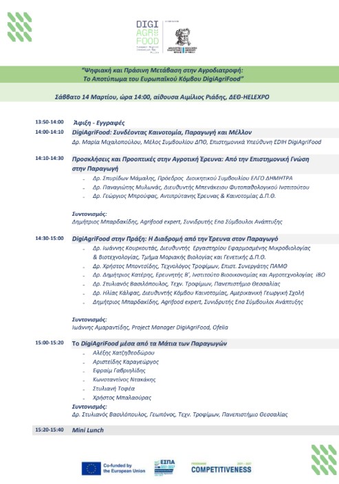 Σε αυτό το πλαίσιο το Δημοκρίτειο Πανεπιστήμιο Θράκης ως επικεφαλής εταίρος του Ευρωπαϊκού Κόμβου Ψηφιακής Καινοτομίας #DigiAgriFood διοργανώνει, το Σάββατο, 14 Μαρτίου 2026 και ώρα 14:00, στην Αίθουσα Αιμίλιος Ριάδης της ΔΕΘ εκδήλωση με θέμα: «Ψηφιακή και Πράσινη Μετάβαση στην Αγροδιατροφή: Το Αποτύπωμα του Ευρωπαϊκού Κόμβου DigiAgriFood».