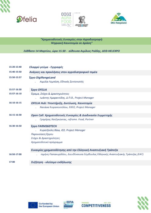 Θα ακολουθήσει παράλληλη εκδήλωση με τίτλο: «Χρηματοδοτικές Ευκαιρίες στην Αγροδιατροφή: Ψηφιακή Καινοτομία σε Δράση» η οποία συνδιοργανώνεται από τα Ευρωπαϊκά Έργα Digi-Rangeland, OFELIA και FARM360TECH.