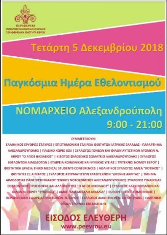 Την 5η Δεκεμβρίου, ημέρα που έχει καθιερωθεί παγκοσμίως ως ημέρα εθελοντισμού, η Περιφερειακή Ενότητα Έβρου διοργανώνει δράση με τη συμμετοχή Συλλόγων και Φορέων που υπηρετούν το πανανθρώπινο ιδεώδες της ανιδιοτελούς προσφοράς στον συνάνθρωπο και την κοινωνία.