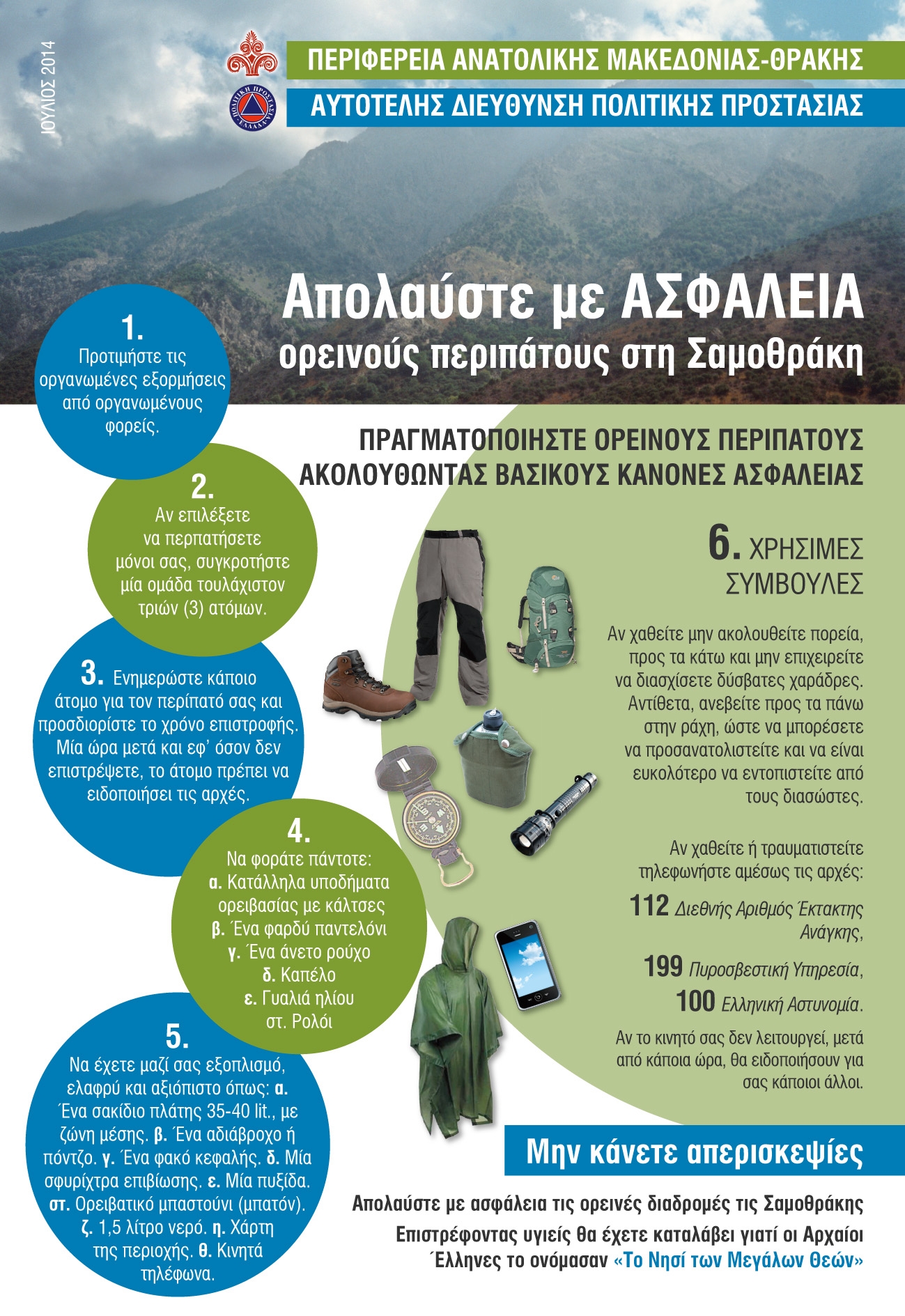 Η δεύτερη δράση αφορούσε την προστασία των περιπατητών στις ορεινές περιοχές της Σαμοθράκης, όπου κάθε χρόνο καταγράφονται αρκετά περιστατικά αγνοουμένων ατόμων και τραυματισμών και για το σκοπό αυτό τύπωσε φυλλάδιο οδηγιών και αφίσες με γενικούς κανόνες ασφάλειας και σε συνεργασία με τοπικούς φορείς του Νησιού (Δήμος Σαμοθράκης, Αστυνομία, Πυροσβεστική, Λιμενικό) μοιράστηκαν στους εκδρομείς ενώ τοποθετήθηκαν αφίσες σε μέρη κοντά στις περιπατιτικές διαδρομές (Βάθρες κ.τ.λ.), σε καταστήματα, ξενοδοχεία, campings κ.τ.λ. καθώς και στο πλοίο της γραμμής Αλεξανδούπολη – Σαμοθράκη.