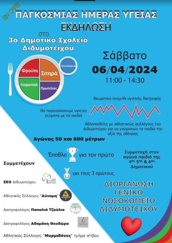 Δράση Αγωγής Υγείας εν’ όψει της Παγκόσμιας Ημέρας Υγείας το Σάββατο, 6 Απριλίου 2024 στο 3ο Δημοτικό Σχολείο Διδυμοτείχου