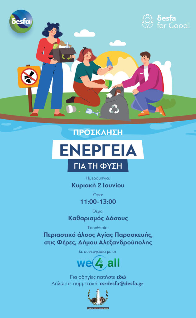 Με αφορμή την Παγκόσμια Ημέρα Περιβάλλοντος ο Δήμος Αλεξανδρούπολης και η Δημοτική Ενότητα Φερών σε συνεργασία με τη ΔΕΣΦΑ και τον Περιβαλλοντικό Οργανισμό We4all, διοργανώνουν εθελοντική δράση καθαρισμού του περιαστικού Άλσους της Αγίας Παρασκευής, την Κυριακή 2 Ιουνίου.