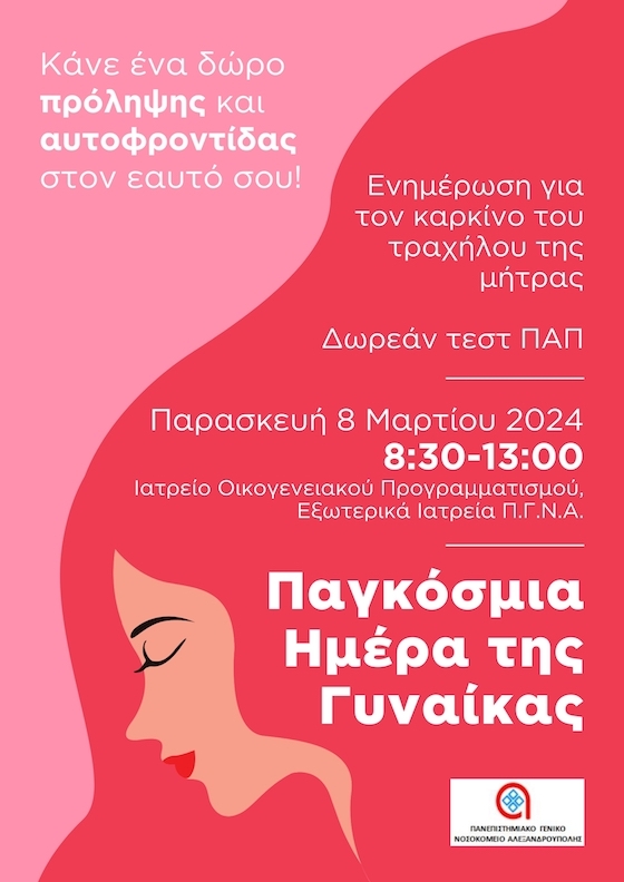 Με αφορμή την γιορτή της Παγκόσμιας Ημέρας της Γυναίκας, το Πανεπιστημιακό Γενικό Νοσοκομείο Αλεξανδρούπολης διοργανώνει, την Παρασκευή 8 Μαρτίου 2024 και ώρα από 08:30 έως 13:00, μια δράση πρόληψης, ενημέρωσης και ευαισθητοποίησης των γυναικών.