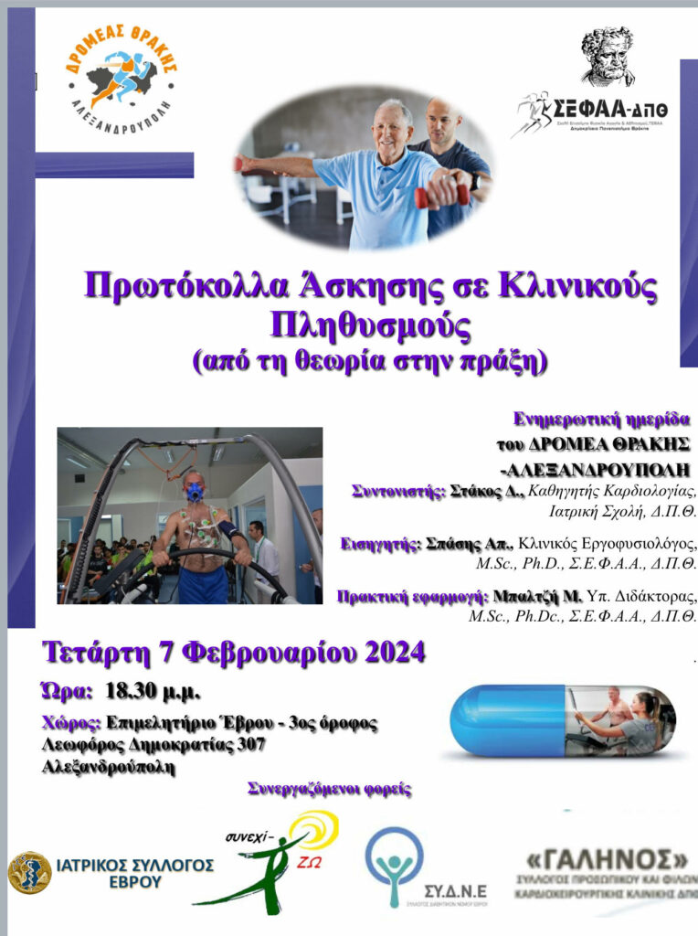 Ενημερωτική ημερίδα υγείας με τίτλο “Πρωτόκολλα άσκησης σε κλινικούς πληθυσμούς (από τη θεωρία στην πράξη)”διοργανώνει ο ΔΡΟΜΕΑΣ Θράκης στην Αλεξανδρούπολη:
