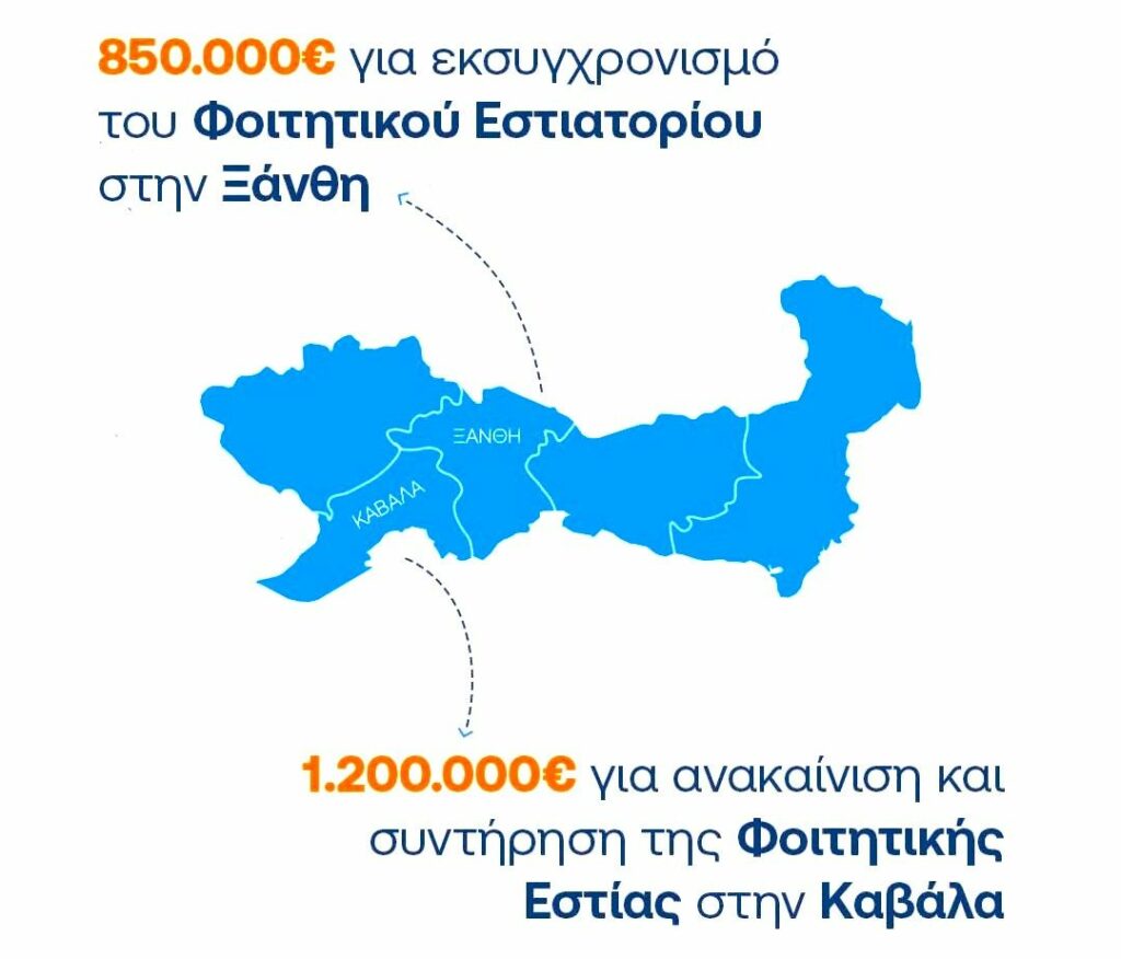 Με ιδιαίτερη ικανοποίηση η Διοίκηση του ΔΠΘ πληροφορήθηκε την ανακοίνωση της χρηματοδότησης συνολικού ύψους άνω των 2 εκατομμυρίων ευρώ από το Υπουργείο Παιδείας, Θρησκευμάτων και Αθλητισμού για την ανακαίνιση και τον εκσυγχρονισμό φοιτητικών υποδομών του ΔΠΘ στην Ξάνθη και στην Καβάλα.