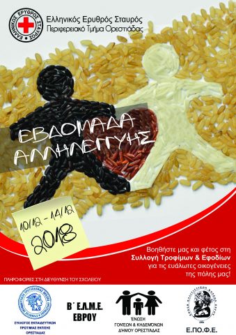 Το Περιφερειακό Τμήμα Ελληνικού Ερυθρού Σταυρού Ορεστιάδας, ο Σύλλογος Εκπαιδευτικών Πρωτοβάθμιας Εκπαίδευσης, η Β’ ΕΛΜΕ Έβρου, η Ένωση Γονέων και η Ένωση Πολιτιστικών Φορέων Έβρου (Ε.ΠΟ.ΦΕ.) συνδιοργανώνουν την Εβδομάδα Αλληλεγγύης με σκοπό τη συγκέντρωση τροφίμων – εφοδίων για τους συνανθρώπους μας, που τεκμηριωμένα έχουν μεγάλη ανάγκη: