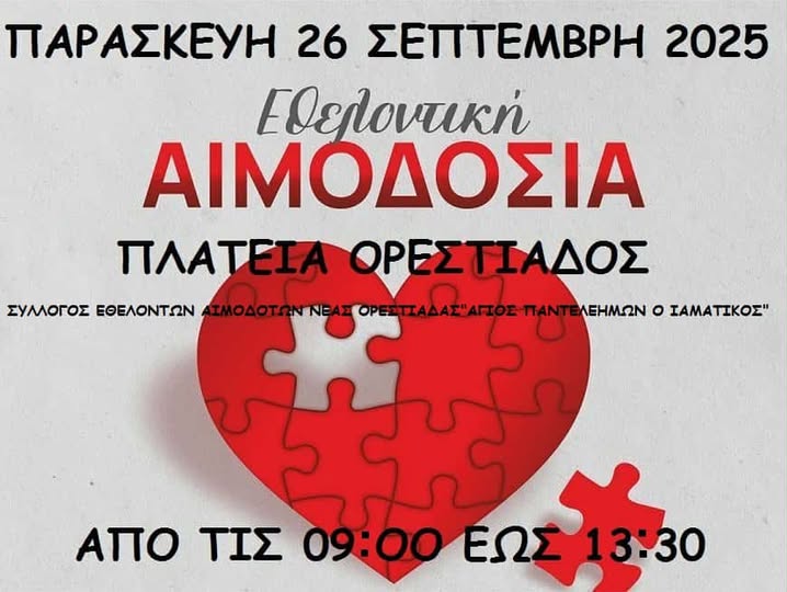 Ο Σύλλογος Εθελοντών Αιμοδοτών «Άγιος Παντελεήμων ο Ιαματικός» του Δήμου Ορεστιάδας διοργανώνει εθελοντική αιμοδοσία την Παρασκευή 26 Σεπτεμβρίου, από τις 9:00 π.μ. έως τις 13:30 μ.μ., στην κεντρική πλατεία του Δήμου Ορεστιάδας.