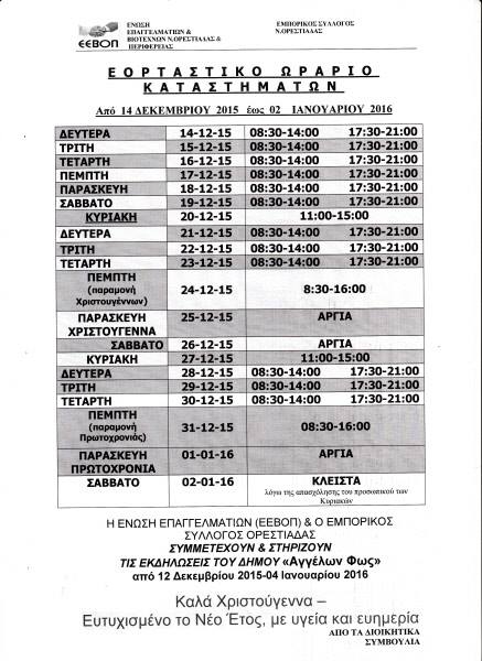 Στις 14 Δεκεμβρίου ξεκινάει φέτος το εορταστικό ωράριο καταστημάτων στην Ορεστιάδα όπως ανακοίνωσε η Ένωση Επαγγελματιών και Βιοτεχνών Ορεστιάδας και Περιφέρειας ενώ ολοκληρώνεται στις 2 Ιανουαρίου 2016 .Επιπροσθέτως η ΈΕΒΟΠ και ο Εμπορικός Σύλλογος συμμετέχουν και στηρίζουν τις εκδηλώσεις του Δήμου Ορεστιάδας <<Αγγέλων Φως>> από τις 12 Δεκεμβρίου.