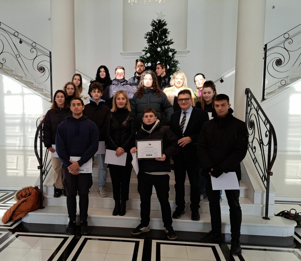 Παράλληλα, ο Αντιπεριφερειάρχης Έβρου βράβευσε τους μαθητές και τους καθηγητές του 4ου Πρότυπου Επαγγελματικού Λυκείου Αλεξανδρούπολης για τη συμμετοχή τους στο Πρόγραμμα του Ευρωπαϊκού Κοινοβουλίου «Σχολεία – Πρέσβεις του Ευρωπαϊκού Κοινοβουλίου» για το σχολικό έτος 2021-2022.