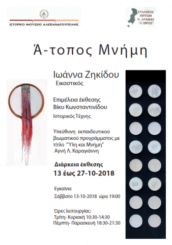 Το Ιστορικό Μουσείο Αλεξανδρούπολης και ο Σύλλογος Εβριτών Νομού Δράμας «Ο Έβρος» διοργανώνουν την εικαστική έκθεση της Ιωάννας Ζηκίδου με τίτλο «Ά-τοπος μνήμη» στο ισόγειο του Ιστορικού Μουσείου. Την έκθεση επιμελείται η Ιστορικός Τέχνης Βίκυ Κωνσταντινίδου. Η έκθεση αποτελεί έναν εικαστικό σχολιασμό του προσφυγικού ζητήματος από το παρελθόν στο παρόν με αφορμή τη συμπλήρωση 96 χρόνων από την υπογραφή της Συνθήκης των Μουδανιών.