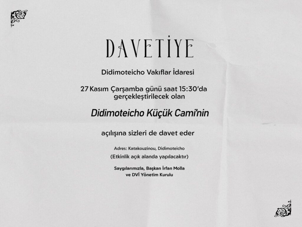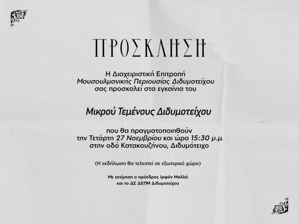 Ο κ. Μολλά κάλεσε όλους τους κατοίκους της περιοχής, ανεξαρτήτως θρησκεύματος, να παραβρεθούν στην τελετή εγκαινίων του ιστορικού αυτού μνημείου του Διδυμοτείχου, το οποίο χρονολογείται από το 1753. “Είμαστε πολύ χαρούμενοι που φτάσαμε στο τέλος πλέον και θα γίνουν τα εγκαίνια“, δήλωσε, σημειώνοντας πως “είναι ο μοναδικός χώρος λατρείας για τους Μουσουλμάνους στο Διδυμότειχο, που εξυπηρετεί μια μεγάλη ακτίνα στον κεντρικό και βόρειο Έβρο“. Με την ευκαιρία της συνέντευξης ο Ιρφάν Μολλά συνέχισε: “Θα ήθελα να προσκαλέσω όλους όσους μας ακούν αυτή τη στιγμή στο ραδιόφωνό σας, όσοι επιθυμούν μπορούν να παραβρεθούν, γιατί είναι μια μεγάλη ευκαιρία να αποδείξουμε την αρμονική συνύπαρξη Μουσουλμάνων και Χριστιανών στην περιοχή μας“. Υπενθύμισε πως είναι ένα ιστορικό κτήριο του οποίου η αξία αναδεικνύεται τώρα περισσότερο με την ανακαίνιση και πως “ούτως ή άλλως το τέμενος, όπως είναι ανοιχτό για θρησκευτικές λειτουργίες και προσευχές, είναι ανοιχτό και για όποιον θέλει, όποια ώρα θέλει, να το επισκεφθεί και να ξεναγηθεί στο χώρο“.