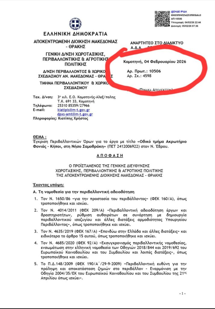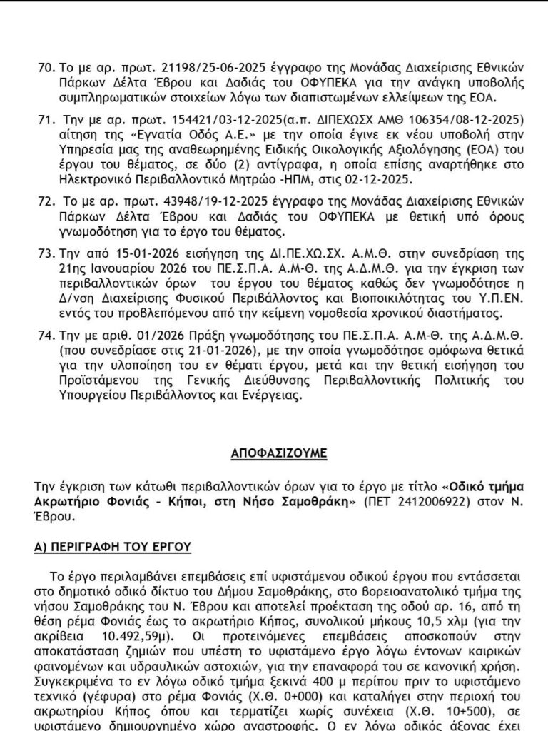 Σημαντική εξέλιξη για ένα από τα πιο κρίσιμα έργα υποδομής της Σαμοθράκης αποτελεί η ολοκλήρωση και ανάρτηση της απόφασης έγκρισης Περιβαλλοντικών Όρων (ΑΕΠΟ) για το έργο «Οδικό τμήμα Φονιάς – Κήπος».