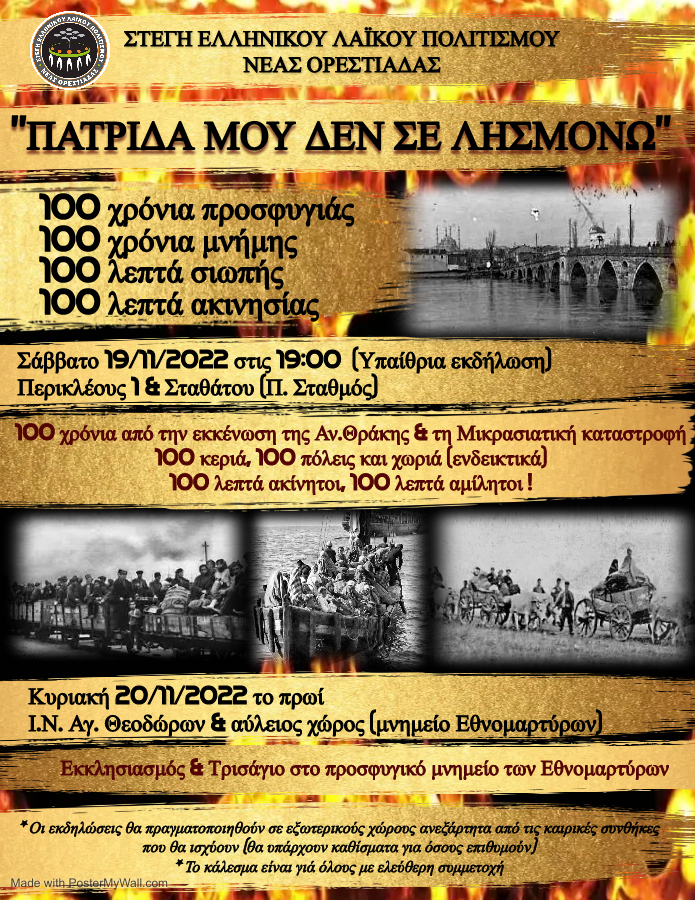 Το Σάββατο 19 Νοεμβρίου 2022 στις 7 το απόγευμα, στην πλατεία του παλιού σταθμού της Ορεστιάδας, μέρος καθαρά συμβολικό καθώς οι σταθμοί τρένων σε διάφορες πόλεις της Ελλαδας υποδέχτηκαν χιλιάδες πρόσφυγες, διοργανώνεται μια σιωπηρή εκδήλωση 100 λεπτών. Η Στέγη Ελληνικού Λαϊκου Πολιτισμού Νέας Ορεστιάδας, που αρκετά από τα μέλη της είναι πρόσφυγες από την άλλη πλευρά του Έβρου, διοργανώνει εκδηλώσεις για τα 100 χρόνια από την εκκένωση της Αν. Θράκης, με τίτλο «Πατρίδα μου δε σε λησμονώ». Στη σχετική ανακοίνωσή του ο σύλλογος σημειώνει τα εξής: