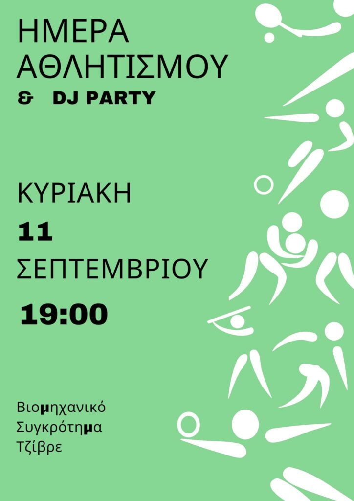 - Την Κυριακή 11 Σεπτεμβρίου “Ημέρα Αθλητισμού” στον χώρο του εμβληματικού Βιομηχανικού Συγκροτήματος των αδελφών Τζίβρε, με Ασκήσεις, Επιδείξεις, Τεράστια Επιδαπέδια Παιχνίδια, mini τουρνουά εκμάθησης και άλλα, αθλητές και μη θα γνωρίσουμε τον μαγικό κόσμο του αθλητισμού με τον πιο δημιουργικό τρόπο. Μετά το πέρας των αθλοπαιδιών θα ακολουθήσει DJ Party