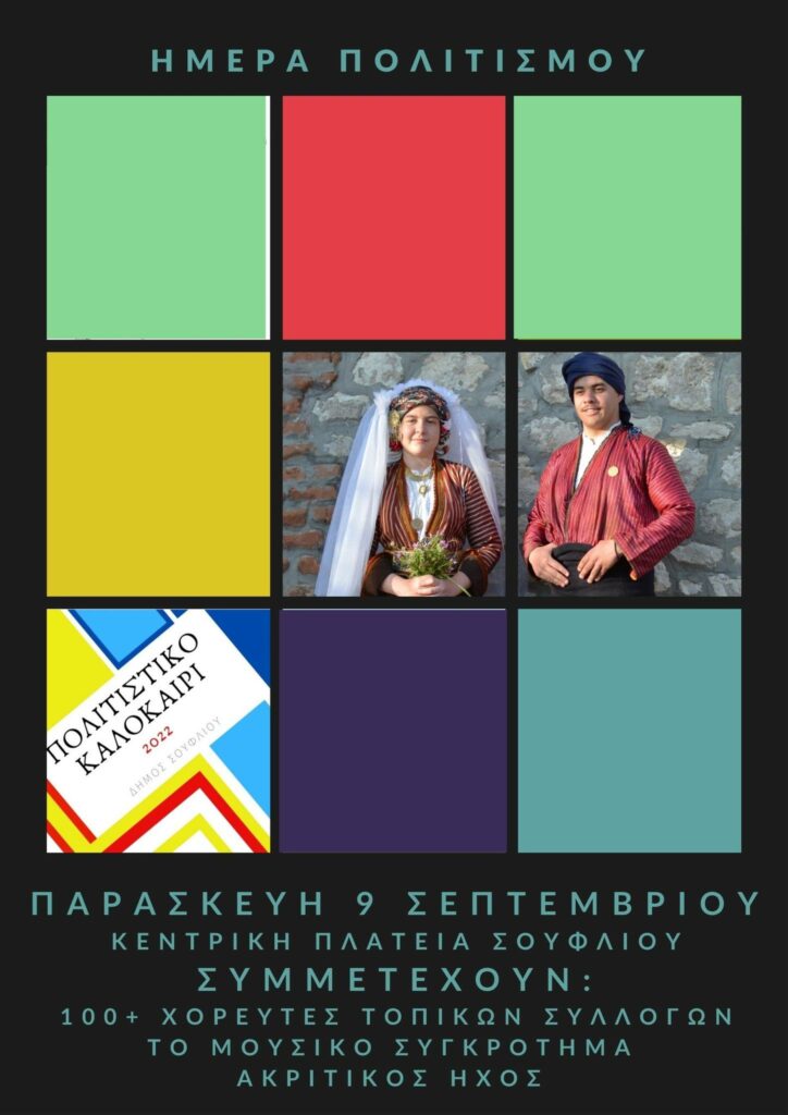 - Αρχικά σήμερα, Παρασκευή 9 Σεπτεμβρίου στην κεντρική πλατεία του Σουφλίου περισσότεροι από 100 χορευτές του Δήμου Σουφλίου πιασμένοι σε έναν κοινό κύκλο χορού, θα χορέψουνε αντάμα σχηματίζοντας μια μεγάλη σπείρα, το σύμβολο της ζωτικής δύναμης, στην “Ημέρα Πολιτισμού”. Στη συνέχεια θα ακολουθήσει παραδοσιακό γλέντι με το μουσικό συγκρότημα “ΑΚΡΙΤΙΚΟΣ ΗΧΟΣ”.
