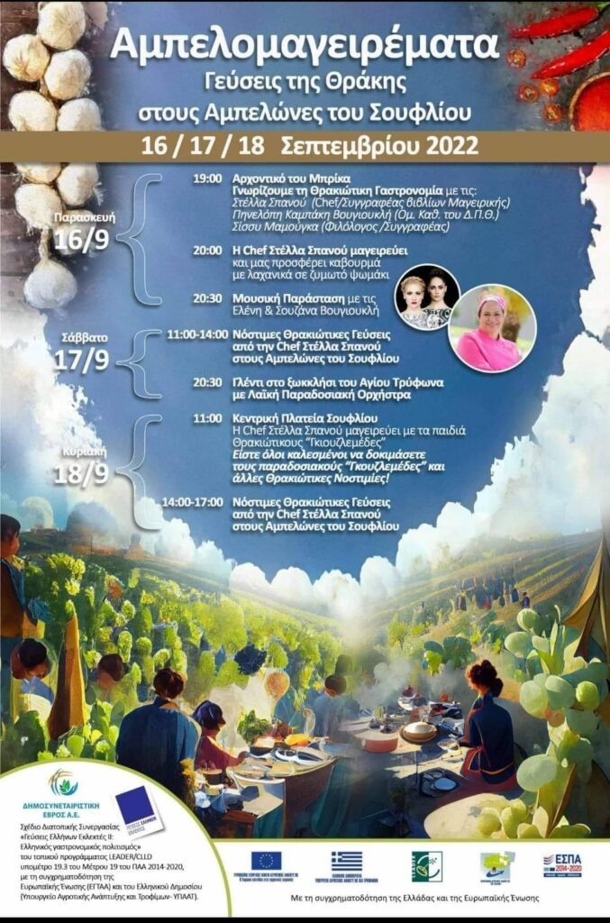 - Ακολουθούν από την Παρασκευή 16 εώς και την Κυριακή 18 Σεπτεμβρίου τα “Αμπελομαγειρέματα, Γεύσεις της Θράκης στους Αμπελώνες του Σουφλίου”, στα πλαίσια αγροτουρισμού και εξωστρέφειας της περιοχής. Παράλληλα, όπως εξήγησε ο κ. Τσιαμίτας, την Κυριακή αναμένεται και η επίσκεψη στο Σουφλί εκπροσώπων από τα Προσκοπικά τμήματα από όλη την Ελλάδα και την Κύπρο, περισσότερα από 100 άτομα, στην πόλη όπου θα συμμετέχουν και στις εκδηλώσεις.