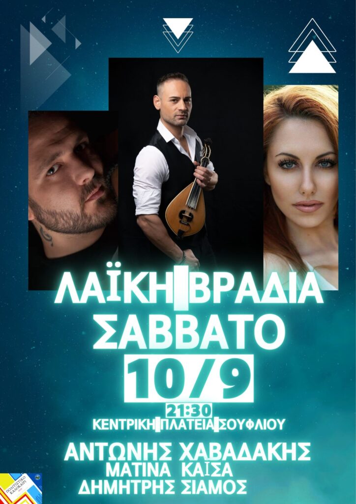 - Το Σάββατο 10 Σεπτεμβρίου στις 21:30 Λαϊκή Βραδιά στην Κεντρική Πλατεία Σουφλίου