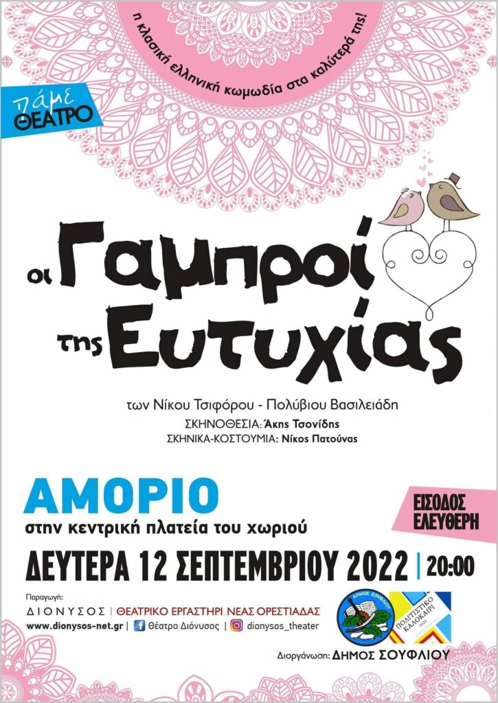 - Την Δευτέρα 12 Σεπτεμβρίου στις 20:00 “Πάμε Θέατρο” με την θεατρική παράσταση “Οι Γαμπροί της Ευτυχίας” στο Αμόριο από το Θεατρικό Εργαστήρι Νέας Ορεστιάδας “Διόνυσος”